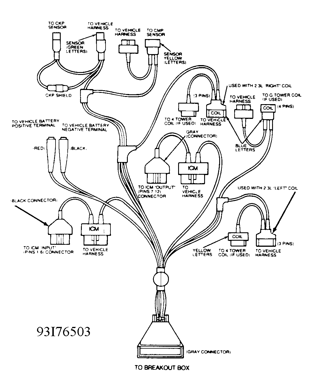 5. Check VBAT At ICM  Connect EI (Low Data Rate) Diagnostic Cable (007-00044) to breakout box. See Figure. Apply 2.3L overlay. Connect diagnostic cable tee to ICM (terminals No. 1-6). Connect diagnostic cable negative lead to battery. Turn ignition on. Measure voltage between J5 (ICM PWR) and J60 (BAT-). If voltage is greater than 10 volts, go to step 6). If voltage is 10 volts or less, repair open VBAT circuit to ICM. See Figure.