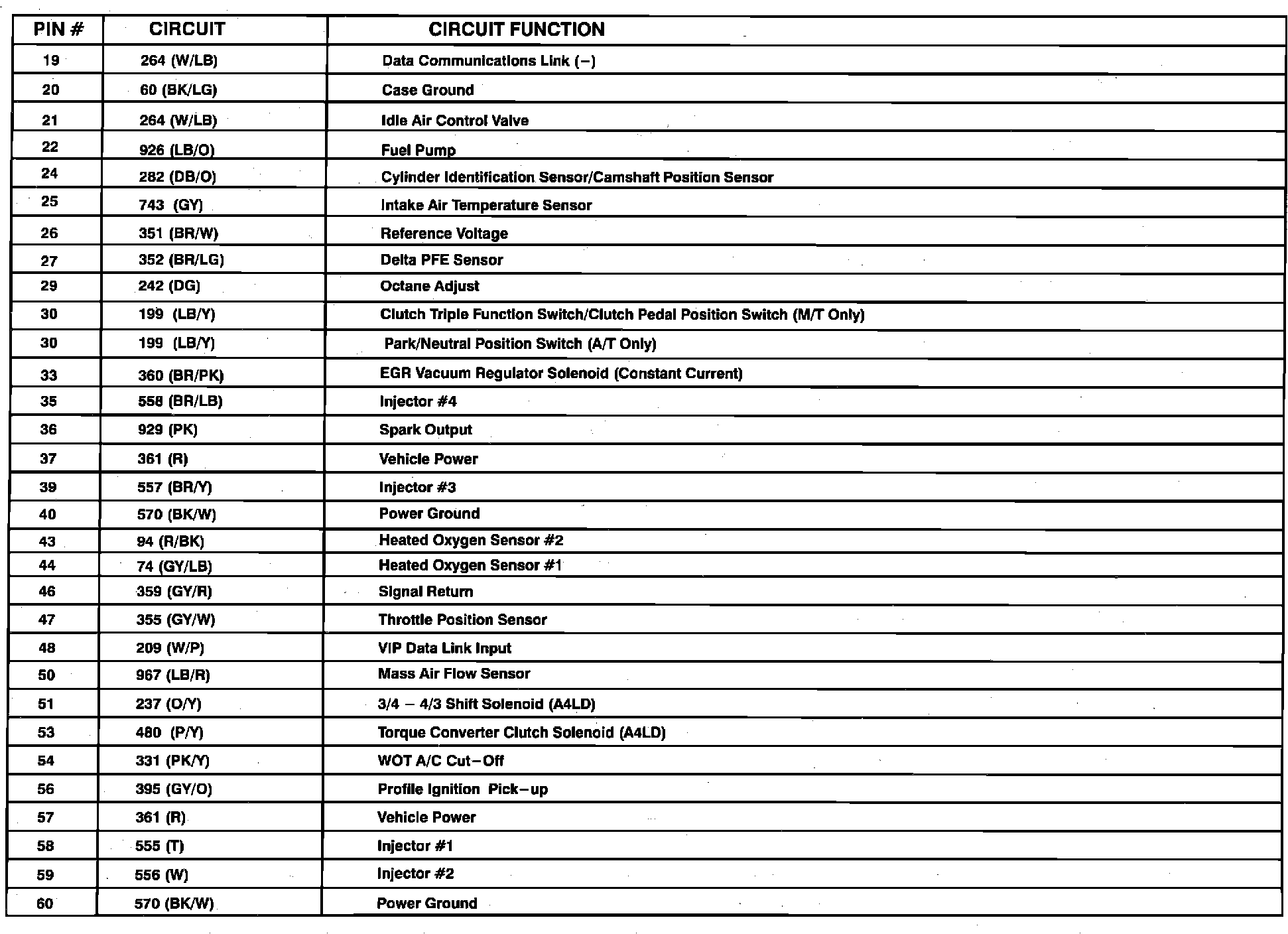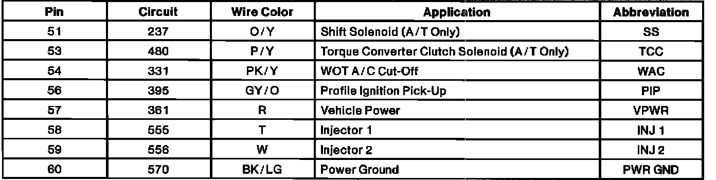 Powertrain Control Module (PCM) Connector Pin Useage: