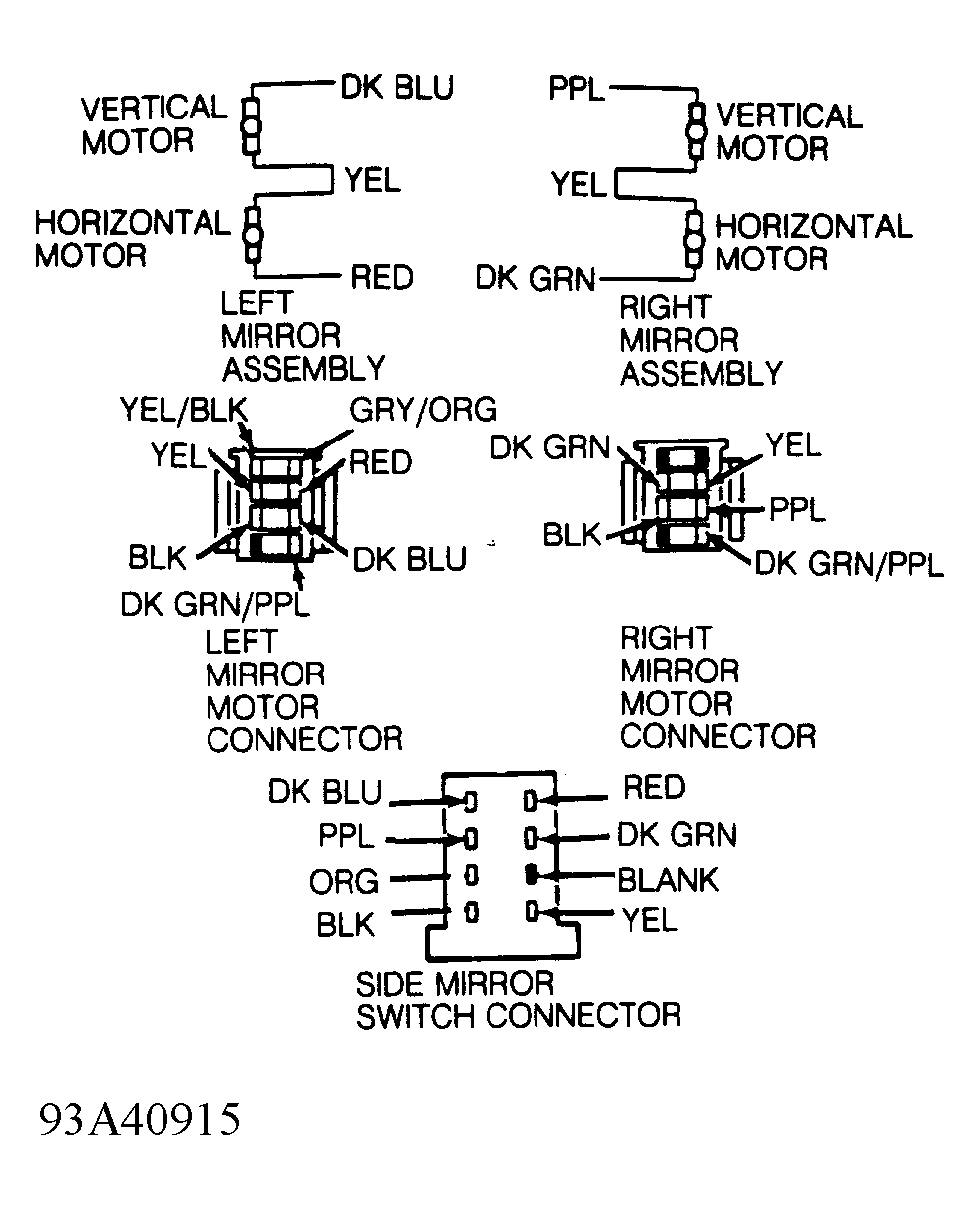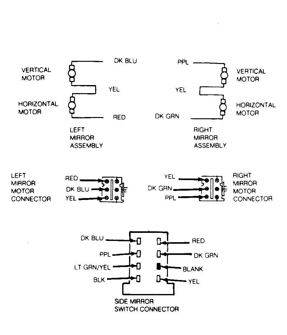 under REMOVAL & INSTALLATION. Using DVOM, check for continuity between specified wires. See appropriate SIDE MIRROR SWITCH TEST table. If switch fails any portion of test, replace switch.