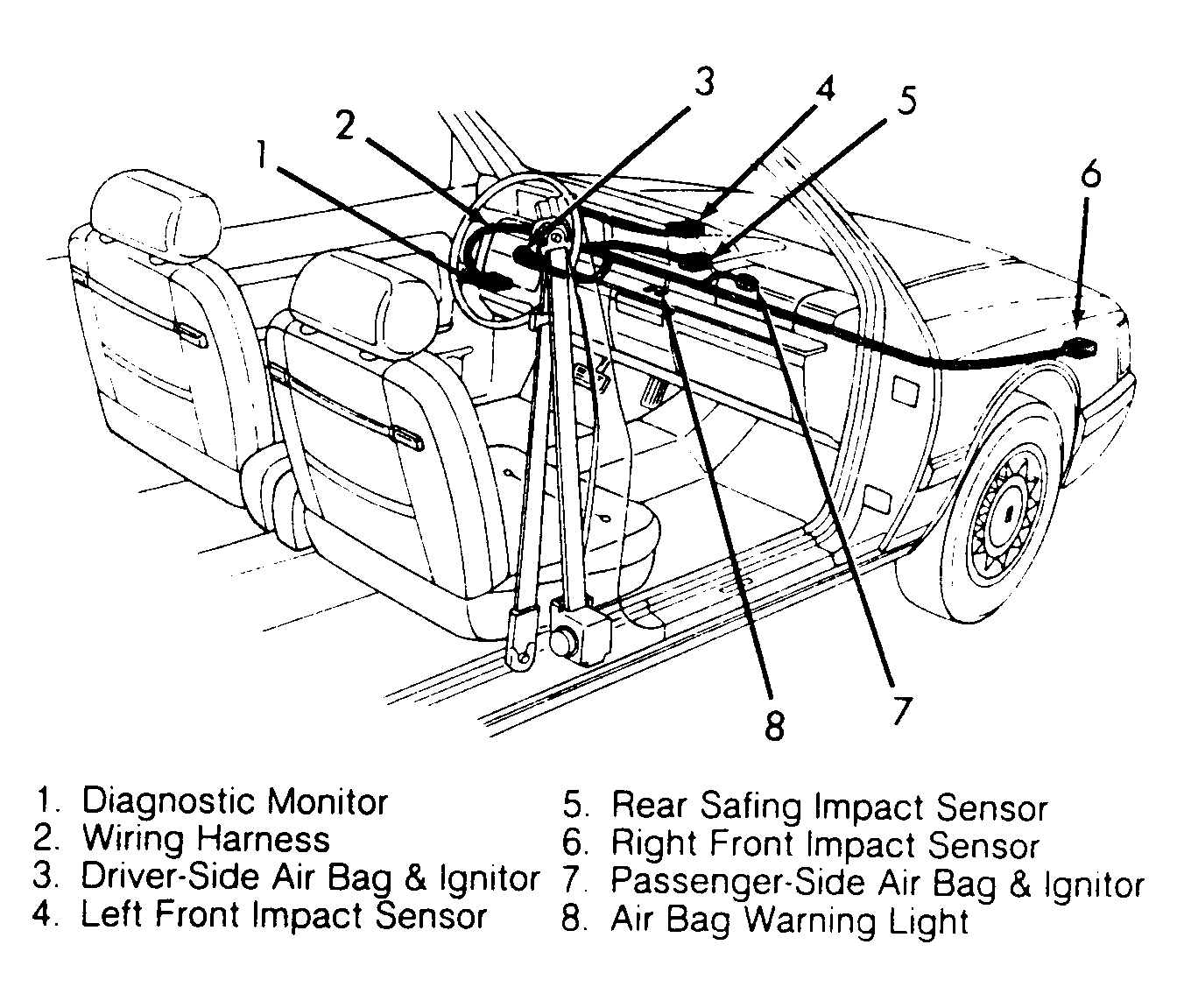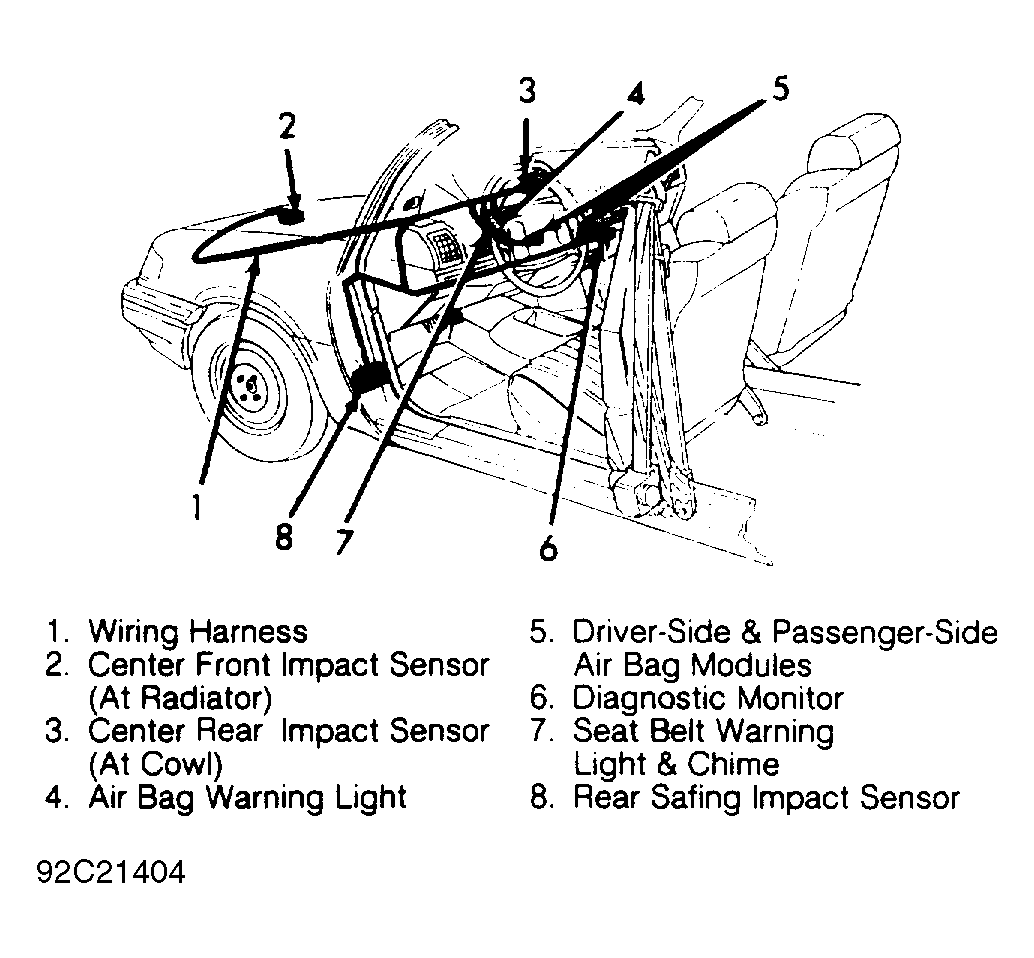- Check Front Impact Sensor Resistance - Disconnect right impact sensor (center cowl sensor on Sable and Taurus). See Figure or Figure . Measure resistance between Pink/Orange wire and Yellow/White wire of sensor connector. If resistance is less than 2 ohms, locate and repair open in Pink/Orange wire or Yellow/White wire. Also, check all connectors, terminals and crimps. Repair as necessary. If resistance is more than 2 ohms, replace impact sensor.
