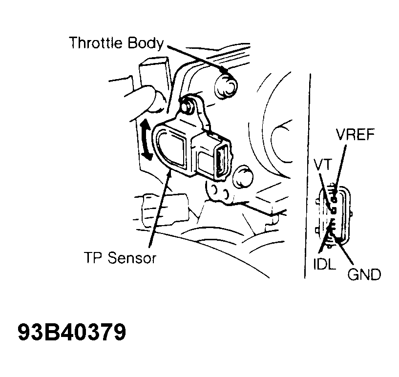- Turn ignition off. Remove TP sensor connector. Install a 0.006" (.15 mm) feeler gauge between throttle plate stop screw and throttle lever. See Figure