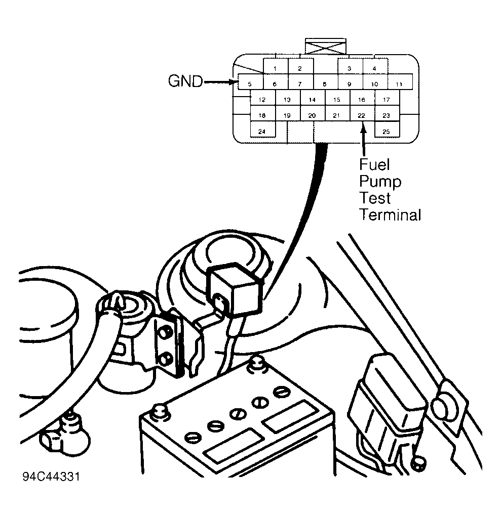 1. Connect fuel pressure gauge between fuel filter and fuel rail. Open main valve and close drain valve. Locate fuel pump test connector in engine compartment. On Aspire, test connector is terminal No. 22 of Data Link Connector, located behind battery, at left shock tower. See Fig 1 .