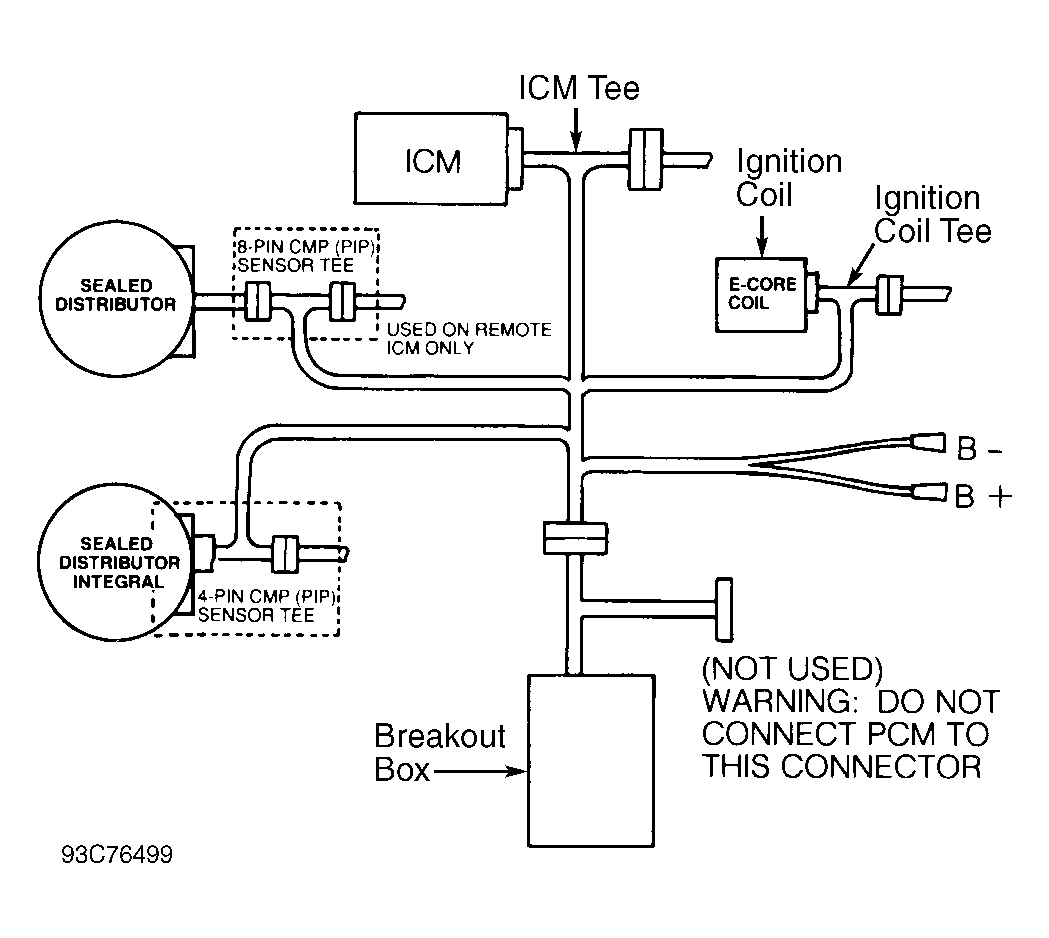 - Turn ignition off. Connect DI Diagnostic Cable (007-00097) to EEC-IV Breakout Box (T83L-50-EECIV), negative battery terminal and ICM. See Figure . Leave B+ lead disconnected. Ensure PIP OPEN/NORMAL/SPOUT OPEN switch is in NORMAL position.