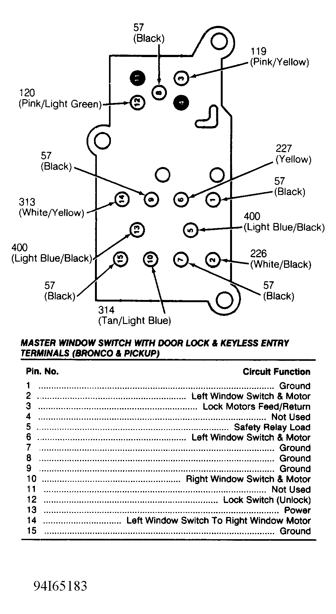 Testing information is not available from manufacturer. See illustration for master window switch with door lock and keyless entry terminal locations. See Fig 1 .