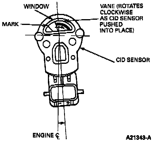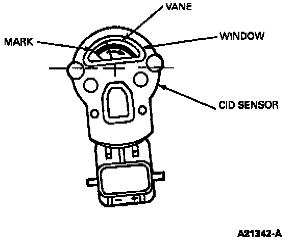 4. Align the CMP sensor rotor as shown with the trailing edge of the vane lined up with the short mark at the left-hand side of the plastic window.
