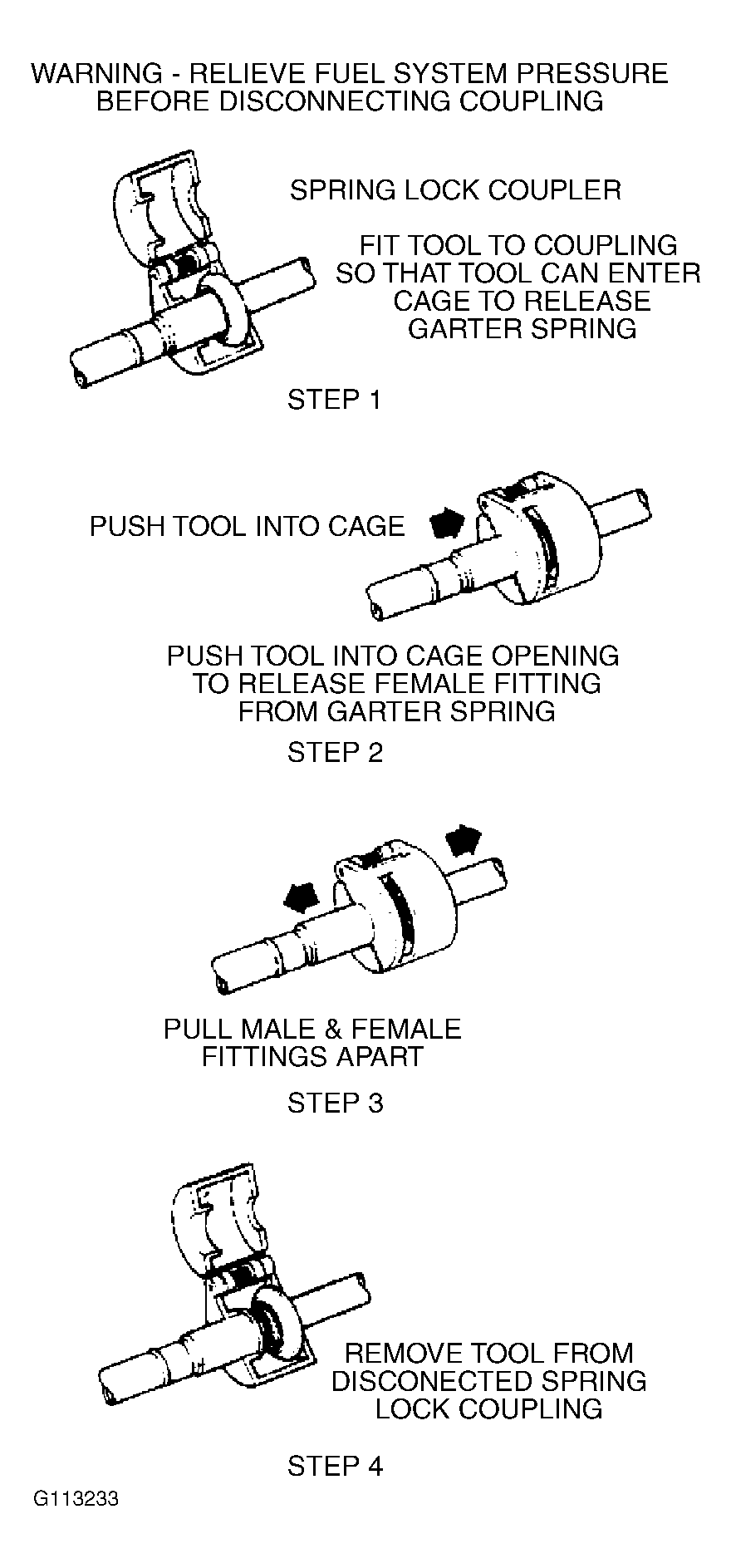 1. Release fuel pressure. See FUEL SYSTEM PRESSURE RELEASE  under FUEL SYSTEM. Place indicated spring lock coupler over coupling. See SPRING LOCK COUPLER IDENTIFICATION  table. To release female fitting from garter spring, push coupler along tube into coupling. See Fig 1 .