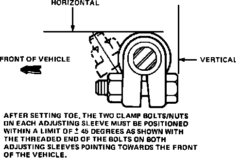 1. Loosen clamp bolts at each end of spindle connecting rod tube, then rotate the sleeve until correct toe alignment of 1/32 inch is obtained.Fig. 4 Toe-In Adjustment: