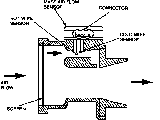 The MAF sensor is located directly in the air flow path between the air cleaner housing and the throttle body. The sensor is designed and located such that all air entering the intake manifold must flow through it. Located in the MAF sensor directly in the airstream are two platinum wires, a hot wire heated by electrical current and a cold reference wire. The MAF sensor uses the air flow across these wires to calculate its output.