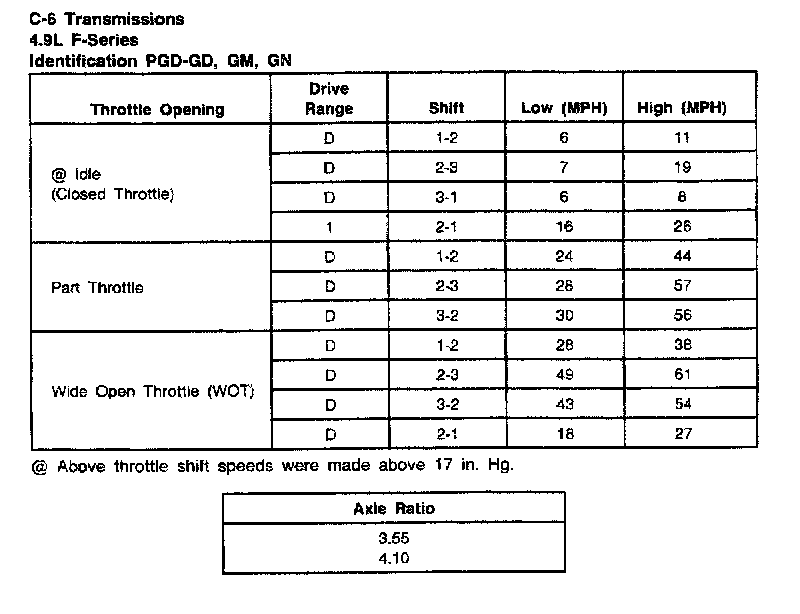 C6 3-spd A/T, Shift Speeds (4.9L F-Series):
