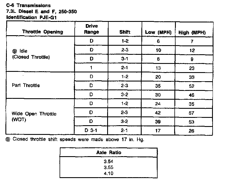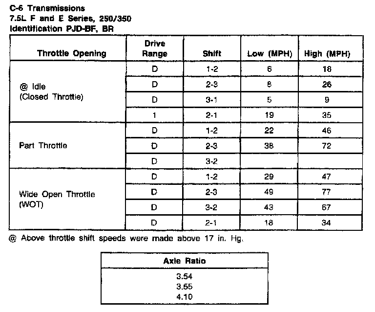 C6 3-spd A/T, Shift Speeds (7.5L E/F Series, 250/350):