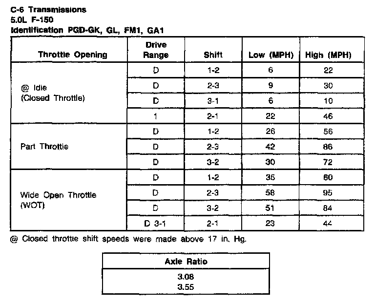 C6 3-spd A/T, Shift Speeds (5.0L F-150):