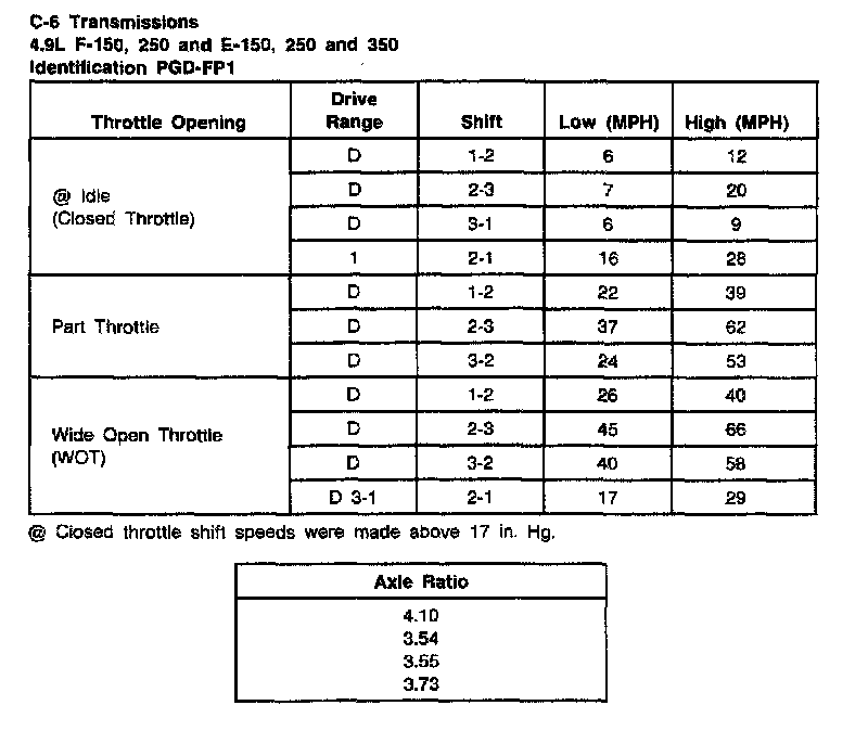 C6 3-spd A/T, Shift Speeds (4.9L F-150/250, E-150-350):
