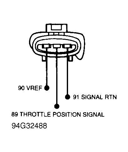 Turn ignition off. Disconnect TP sensor wiring harness connector. Turn ignition on. Measure voltage between VREF and SIG RTN at TP sensor wiring harness connector. If voltage is 4-6 volts, connect TP sensor and go to next step. If voltage is not 4-6 volts, go to CIRCUIT TEST C . - 22) Check Signal Circuit For Short To Ground