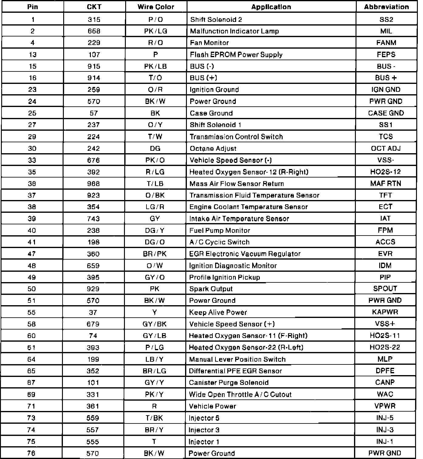 PCM Connector Pin Usage (part 1 Of 2):