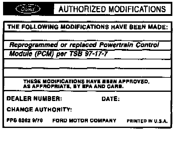 Obtain an Authorized Modification Decal (FPS 8262 - obtainable through DOES II, 25/pkg) and list the date, dealer number, and summary of modifications performed. Select a prominent place adjacent to the Vehicle Emission Control Information Decal suitable for installing the Authorized Modifications Decal. Clean the area, install the decal, and cover it with a clear plastic decal shield.