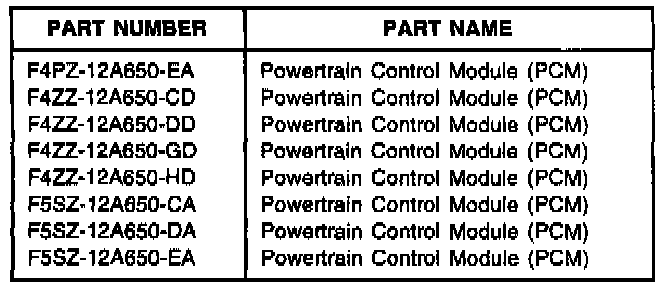 1. Perform the EEC-V self test. If any of the subject codes appear, reprogram or replace the PCM. Dealers with SBDS are required to reprogram the PCM using the latest calibration CD-ROM. Dealers without SBDS, refer to the PCM Replacement Chart in this article to determine the correct PCM to install.