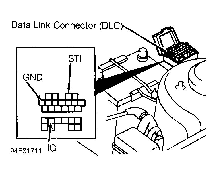 - Connect timing light to No. 1 spark plug wire. Use jumper wire to connect Data Link Connector (DLC) STI terminal to GND terminal. See Fig 1