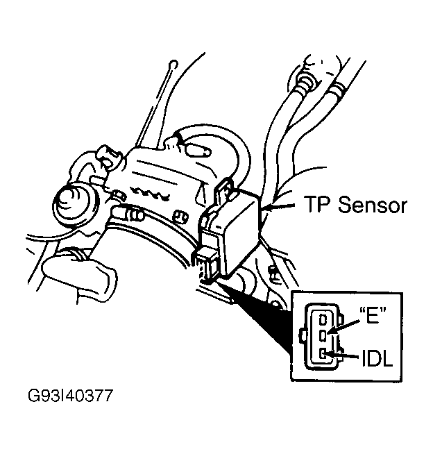 - Turn ignition off. Remove TP sensor connector. Install a 0.016" (.40 mm) feeler gauge between throttle plate stop screw and throttle lever. See Figure