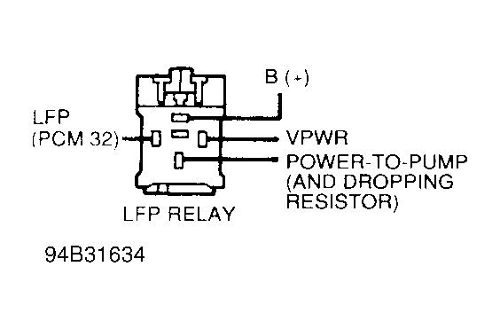 166) Check LFP Relay Turn ignition off. Leave LFP relay disconnected. Measure resistance between fuel pump relay terminals LFP and VPWR. See Fig 3. Resistance should be 40-85 ohms. Measure resistance between fuel pump relay terminal LFP and terminals PUMP-TO-POWER and B+. Both measurements should be 10,000 ohms or more. If all resistances are correct, go to next step. If all resistances are not correct, replace LFP relay.