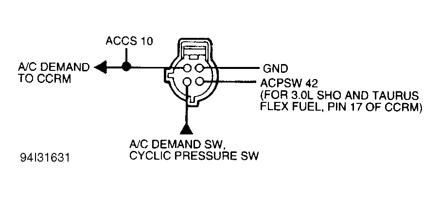 155) Check A/C Pressure Switch (ACPSW) Ensure ignition is off and breakout box is installed with PCM disconnected. Ensure ACPSW and CCRM wiring harness connectors are disconnected. Measure resistance between test pins No. 31 and 40. If resistance is now greater than 10,000 ohms, check ACPSW for correct operation and repair as necessary. If resistance is less than 10,000 ohms, repair short to ground in HFC circuit.