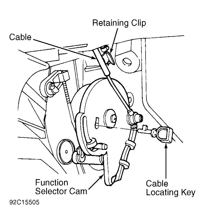 - Remove trim panel under glove box. Disconnect cable from retaining clip next to function control cam. Ensure lever is fully in defrost position, and reconnect cable to retaining clip. Remove locating key. Ensure lever operates through its full range of travel on control panel. Install trim panel.