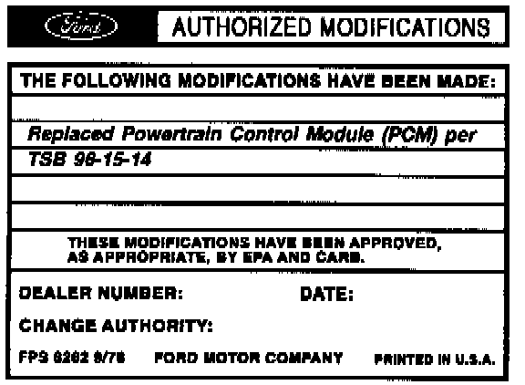 Obtain an Authorized Modifications Decal and list the date, dealer number, and summary of modifications performed. Select a prominent place adjacent to the Vehicle Emission Control Information Decal suitable for installing the Authorized Modifications Decal. Clean the area, install the decal, and cover it with a clear plastic decal shield.