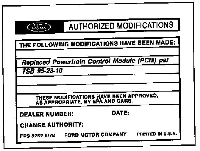 Obtain an Authorized Modification Decal and list the date, dealer number, and summary of modifications performed. Select a prominent place adjacent to the Vehicle Emission Control Information Decal suitable for installing the Authorized Modifications Decal. Clean the area, install the decal, and cover it with a clear plastic decal shield.