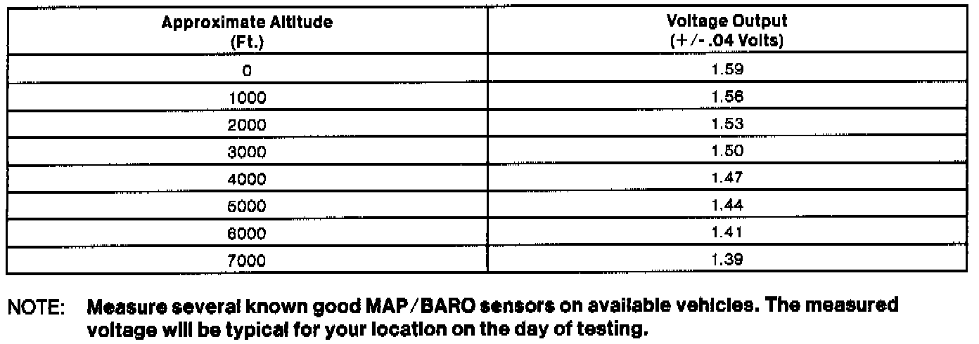 NOTE: Special Tool Required. MAP/BP Sensor Tester 105-00001. This tool converts the frequency output of the Manifold Absolute Pressure (MAP) / Barometric Pressure (BARO) sensor to analog DC signal, and verifies the sensor reference voltage is within normal parameters.