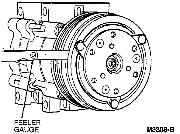 6. Check the air gap between the A/C clutch and the A/C compressor clutch pulley mating surfaces with a feeler gauge.