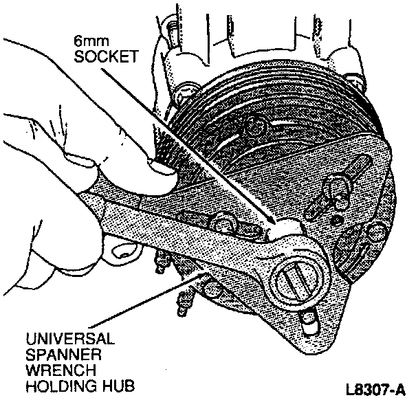 1. Remove the A/C clutch retaining bolt. Use Spanner Wrench T7OP-4067-A.