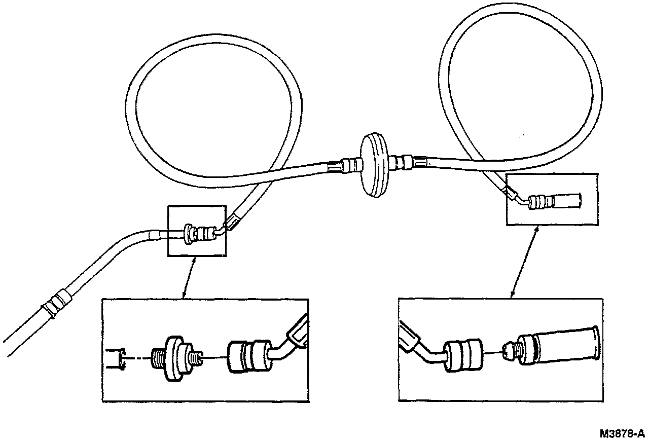 10. Install the suction filter in the suction hose close to the A/C compressor. The suction filter shown in the illustration is for the nylon lined core hose. These filters have two grooves in the end tubes to accommodate 0-ring seals.