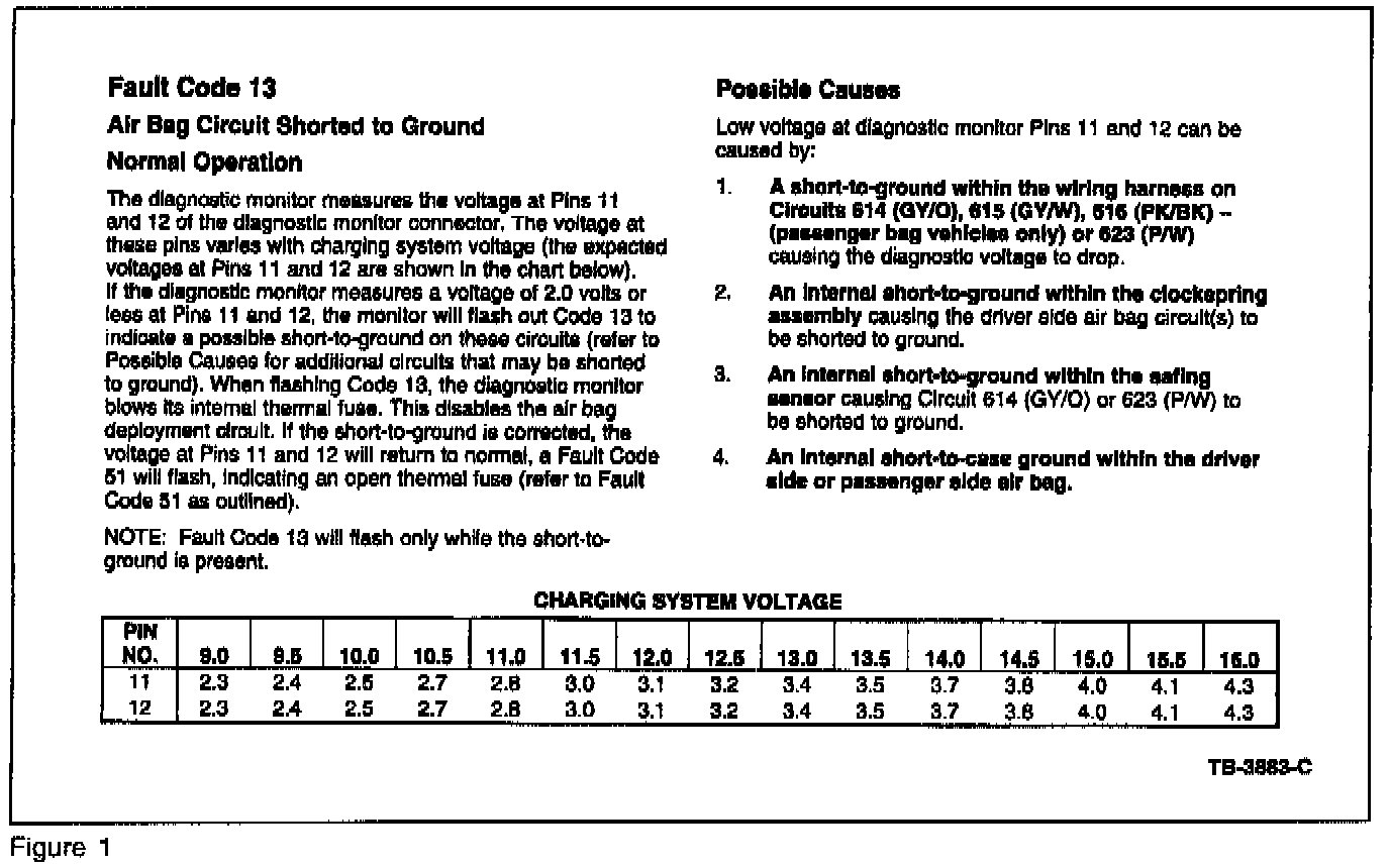 2. The diagnostic monitor recognizes the shorted wiring and, depending on which circuit the short occurred, flashes either a Code 13 (air bag circuit shorted) or Code 14 (primary crash circuit shorted). Refer to Figures 1 and 2 for Code 13 and Figures 3 and 4 for Code 14.