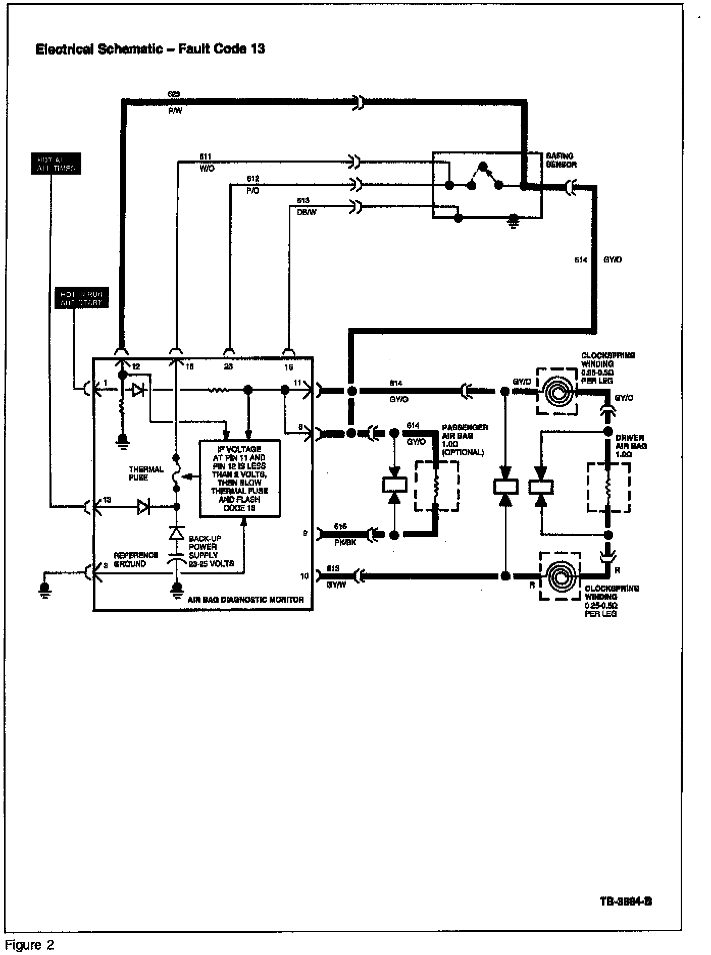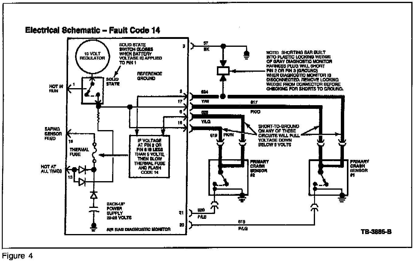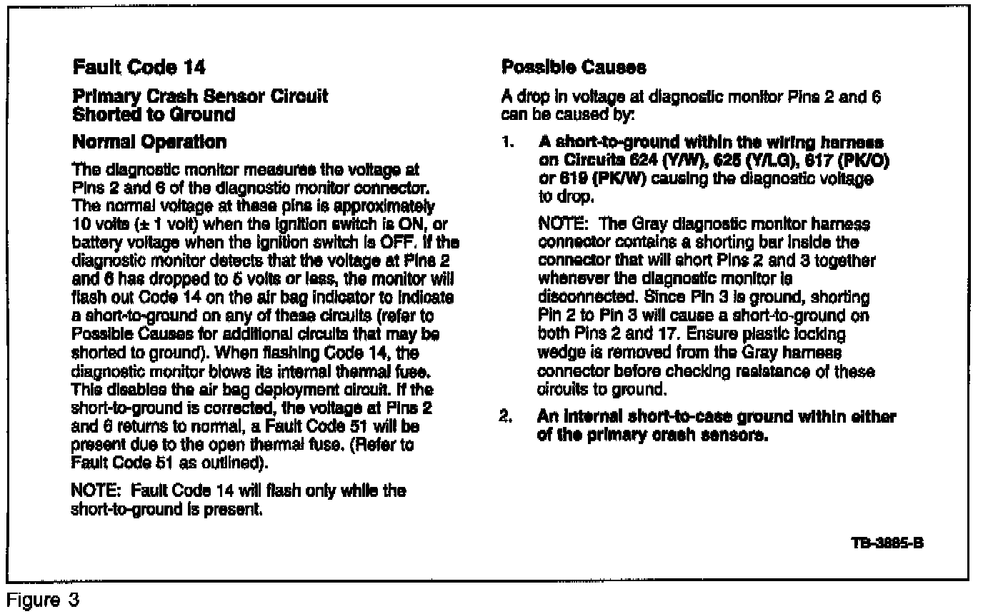 IT MAY BE POSSIBLE TO REPEAT THE FAULT CODES 13 OR 14 BY MOVING ("SHAKE-WIGGLE" TEST) THE WIRING TO RECREATE THE ORIGINAL SHORT. HOWEVER, THIS WILL REQUIRE THE REACTIVATION OF THE AIR BAG SYSTEM, WHICH WILL AGAIN REQUIRE DEACTIVATION OF THE AIR BAG SYSTEM AFTER THE TEST IS PERFORMED.