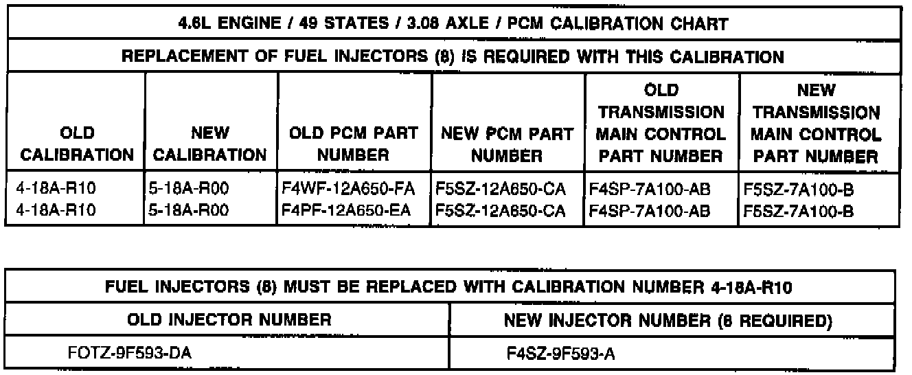 ^ 4.6L Engine - Reprogram or replace the PCM with the 1995 calibration (see Application Charts) and replace the Transmission Main Control Assembly with the revised 1995 part. Refer to the following Service Procedure.