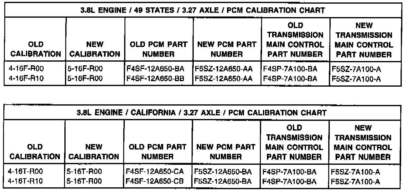 ^ 3.8L Engine - Replace the PCM with the 1995 calibration (see Application Charts) and replace the Transmission Main Control Assembly with the revised 1995 part. Refer to the following Service Procedure.