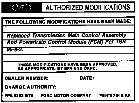 IF INSTALLING A FORD AUTHORIZED REMANUFACTURED TRANSMISSION WITH A 1995 LEVEL MAIN CONTROL, THE PCM CALIBRATION MUST BE CHANGED TO THE 1995 LEVEL. THE FORD AUTHORIZED REMANUFACTURED TRANSMISSION WITH THE 1995 LEVEL MAIN CONTROL WILL BE TAGGED TO INDICATE THE 1995 LEVEL MAIN CONTROL HAS BEEN INSTALLED. FAILURE TO UPDATE THE PCM COULD RESULT IN DAMAGE TO THE FORD AUTHORIZED REMANUFACTURED TRANSMISSION. THE MAIN CONTROL WILL NOT HAVE TO BE REPLACED. THE UPDATED MAIN CONTROL IS INCLUDED WITH THE FORD AUTHORIZED REMANUFACTURED TRANSMISSION. REFER TO THE SERVICE PROCEDURE FOR DETAILS.