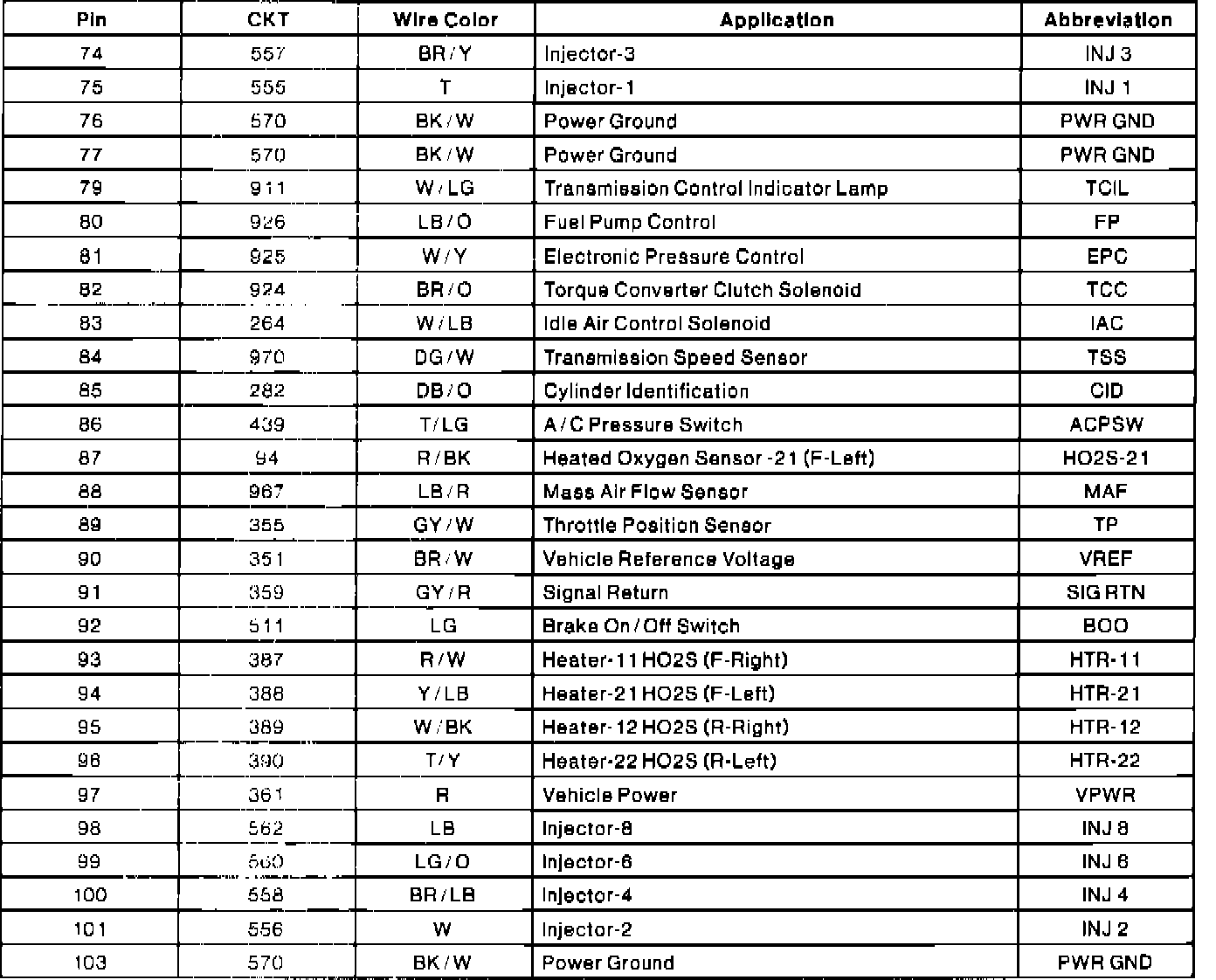 PCM Connector Pin Usage (Part 2 Of 2):