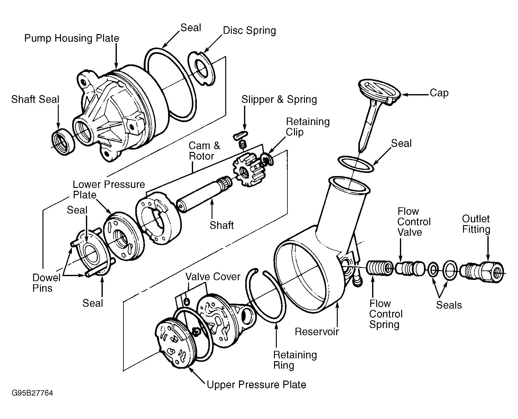C-II power steering pump is a belt-driven, slipper-type integral pump with a fiberglass/nylon reservoir. Reservoir is attached to rear of pump housing plate. See Fig 2 . Pump body is encased within housing and reservoir.