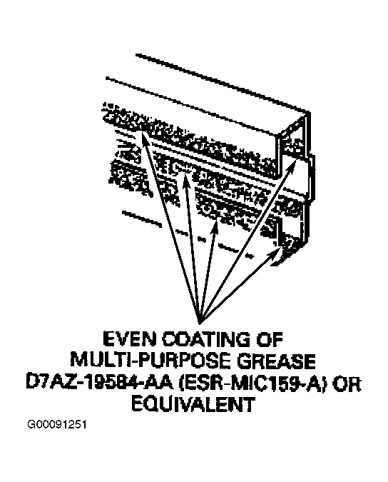 The door window regulators should be properly lubricated to provide ease of operation. The window glass mechanism should be lubricated whenever the glass channel or window regulator is removed, or excessive effort is required to operate the windows. To lubricate a door window mechanism, apply an even coating of Multi-Purpose Grease (D7AZ-19584-AA) or equivalent meeting Ford specification ESR-M1C159-A to the window regulator rollers, shafts and the entire length of the roller guides as illustrated by the shaded areas. See Fig 1 .