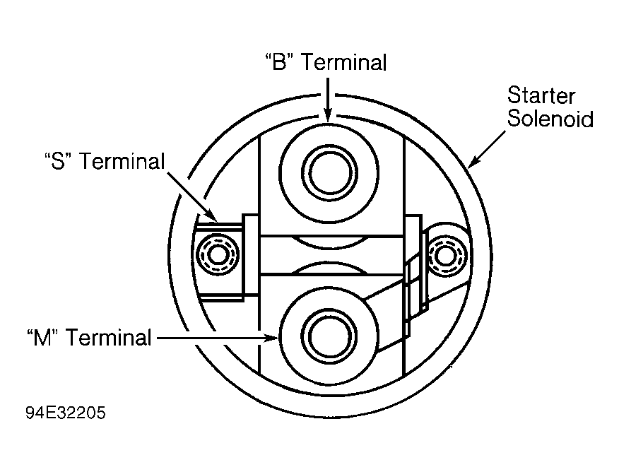 3. Connect a jumper wire between battery positive terminal and "S" terminal on starter solenoid. See Figure . Ensure starter drive ejects completely and starter spins rapidly. Observe ammeter reading.