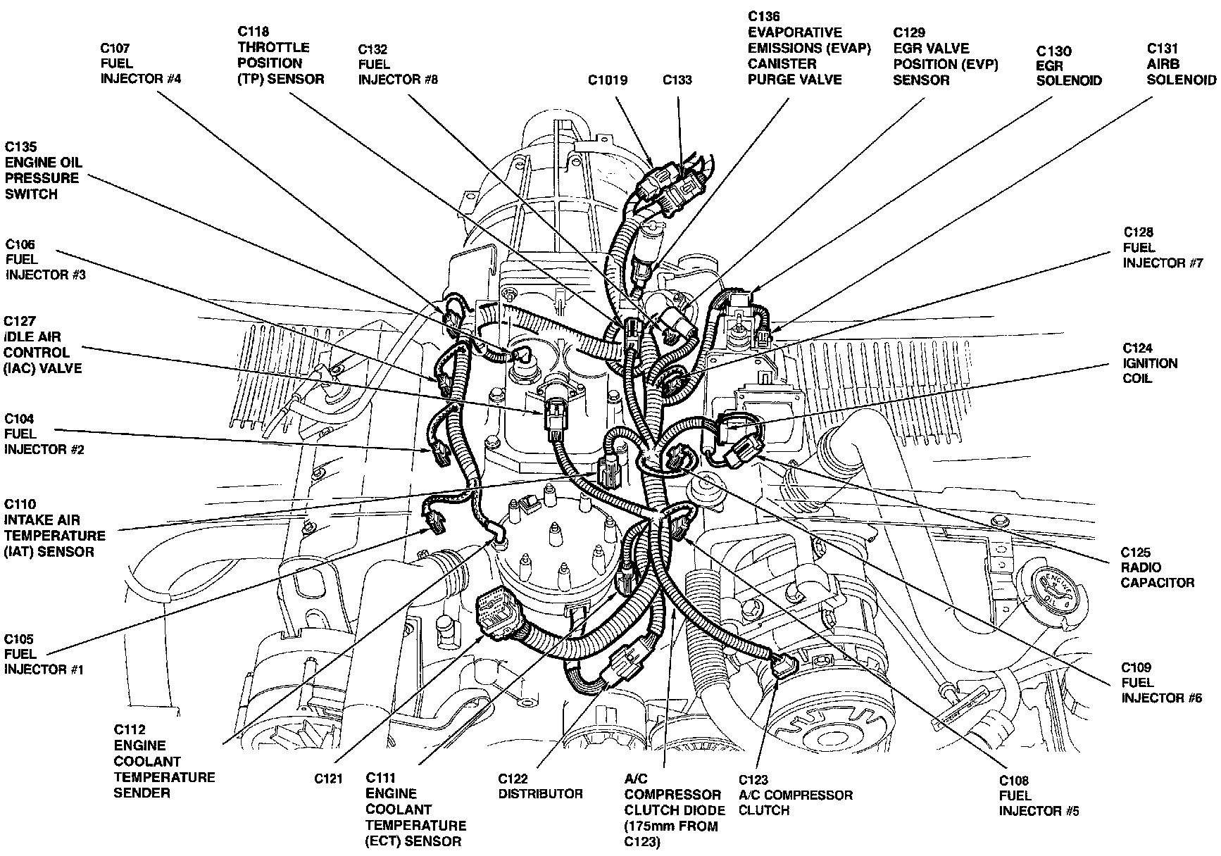 The Engine Coolant Temperature Sensor is located at the top front of engine, near distributor