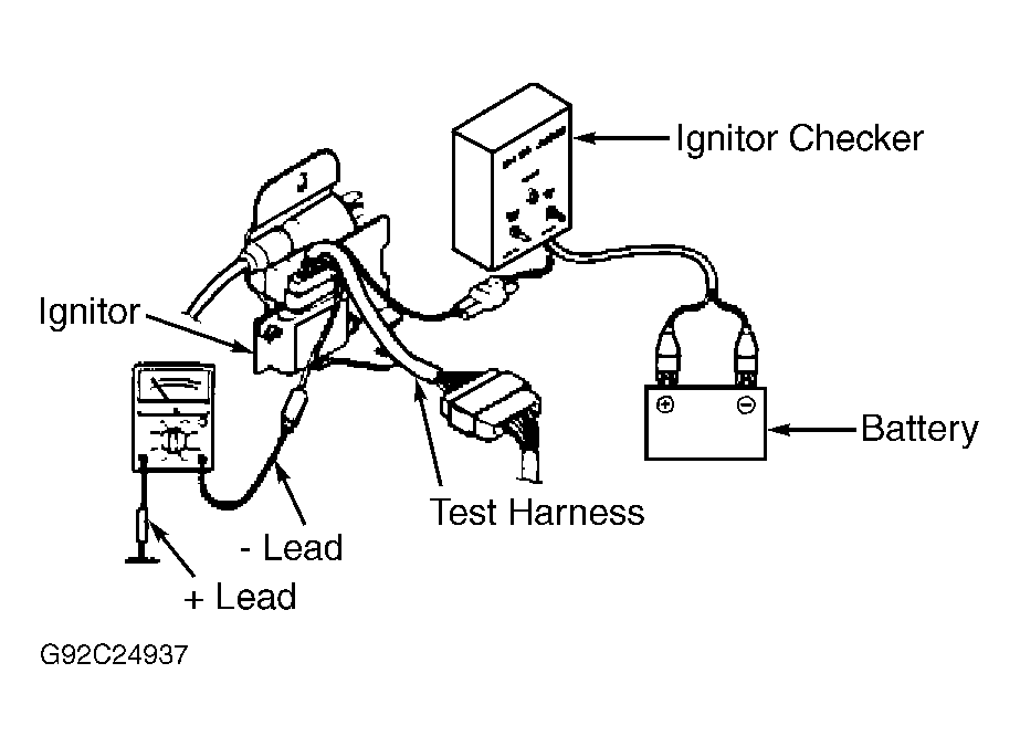 2. Connect Ignitor Checker (49 F018 002) to other lead of test harness and to battery. Set ohmmeter to X1 scale.