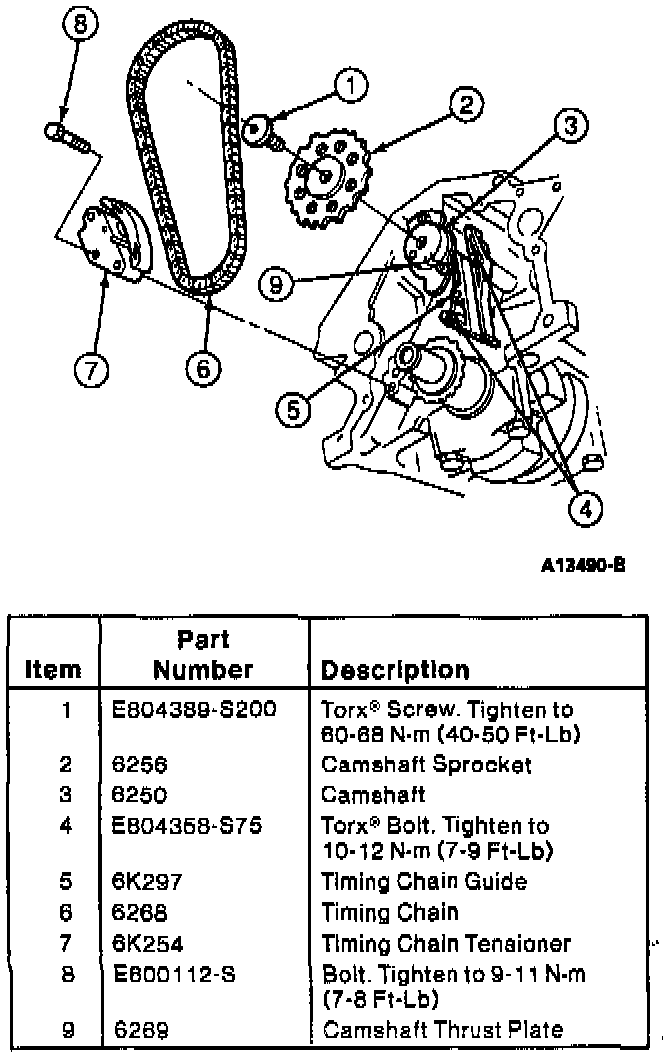 5. Install the camshaft sprocket retaining bolt, and tighten to 60-68 Nm (44-50 ft lb).
