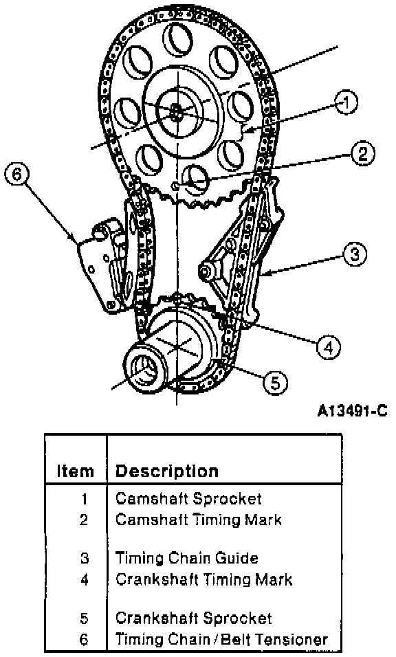NOTE: Make sure that the tensioner side of the timing chain is held inward, and that the guide side of the chain is straight and tight.