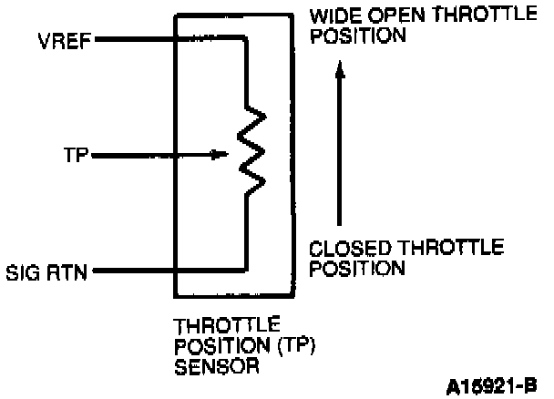 The TP sensor measures travel of the throttle shaft to produce a continuously variable output signal proportional to the throttle plate position.