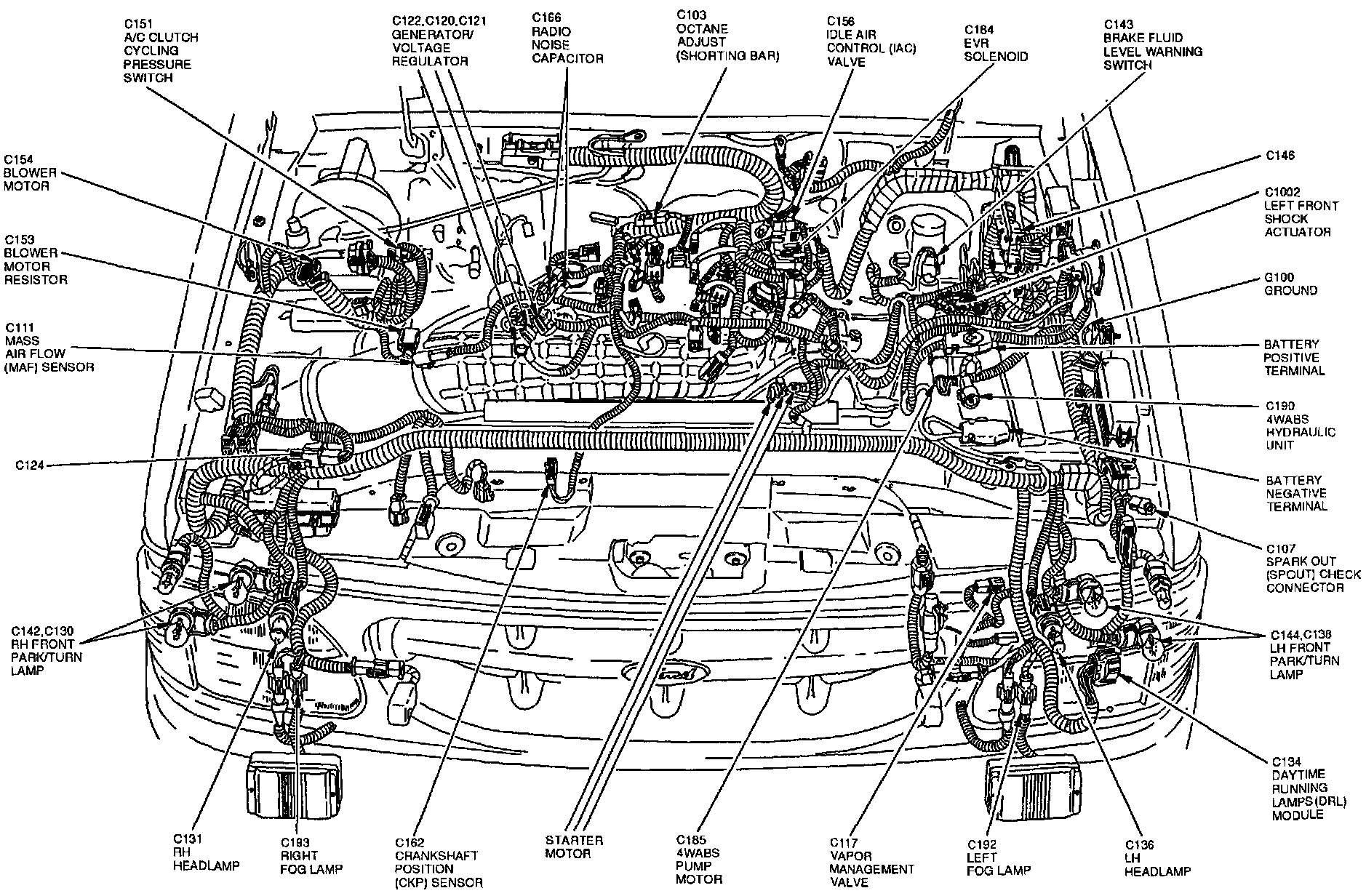 The SPOUT check connector (C107) is located at the LF corner of engine compartment.