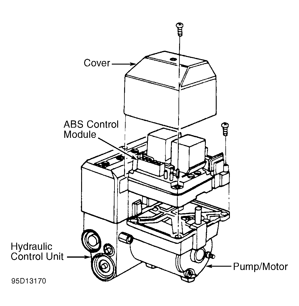 Hydraulic control unit and ABS control module are a complete assembly. See Fig 1 . The assembly is located in right front corner of engine compartment, below engine coolant reservoir. The assembly is mounted inside a bracket attached to right frame rail.