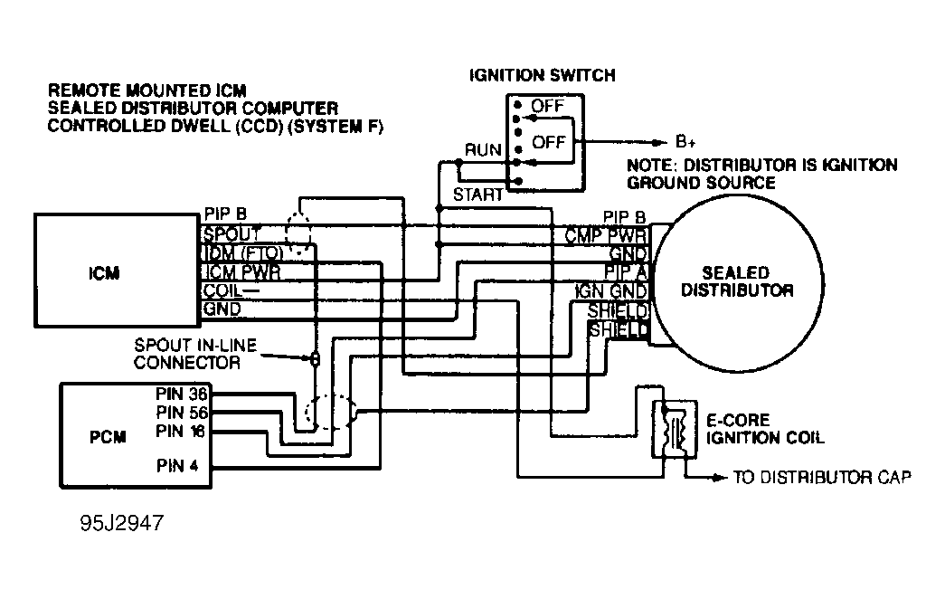 1. Connect Test Equipment  Turn ignition off. Connect DI Diagnostic Cable (007-00097) to EEC-IV Breakout Box (T83L-50-EEC-IV), negative battery terminal and ICM. See Figure. Leave B+ lead disconnected. Ensure PIP OPEN/NORMAL/SPOUT OPEN switch is in NORMAL position. Use DI overlay on breakout box. Disconnect PCM and go to next step.