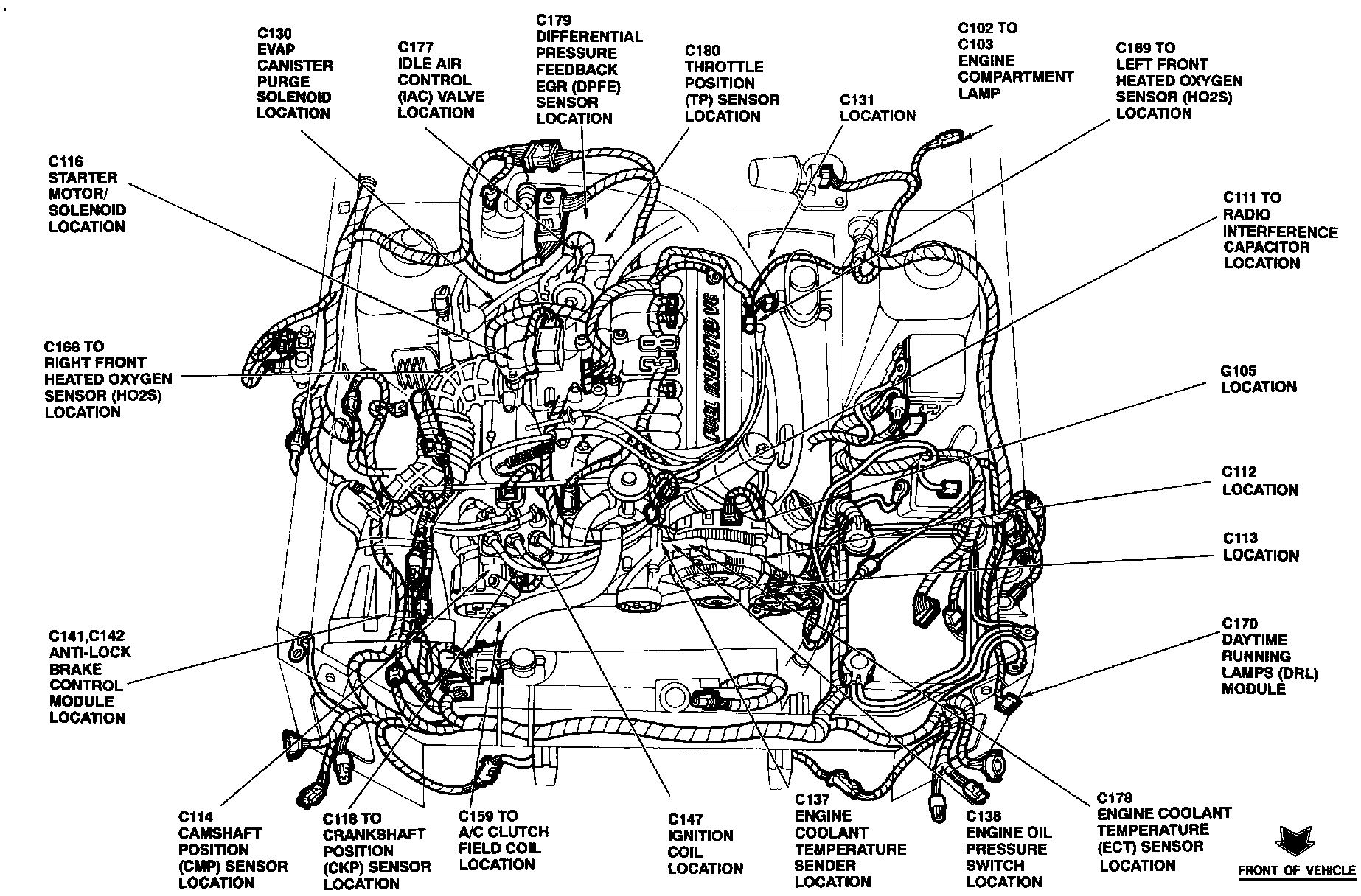 The Engine Coolant Temperature Sensor is located at the top front of the engine, behind ignition coil.