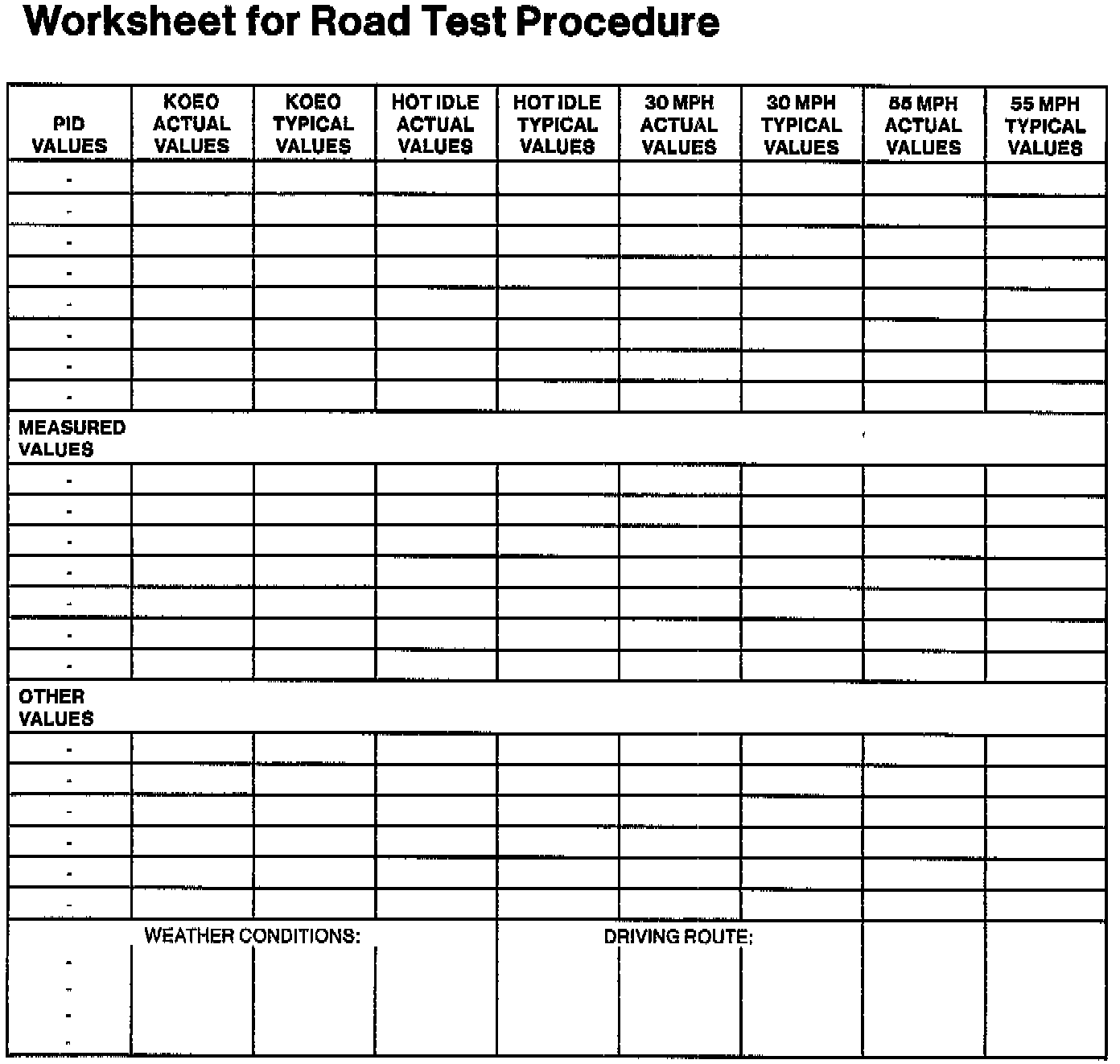 Use the Worksheet for Road Test Procedure to list the typical values from the Diagnostic Reference Values, Normal Scan Data Values - Includes Pids